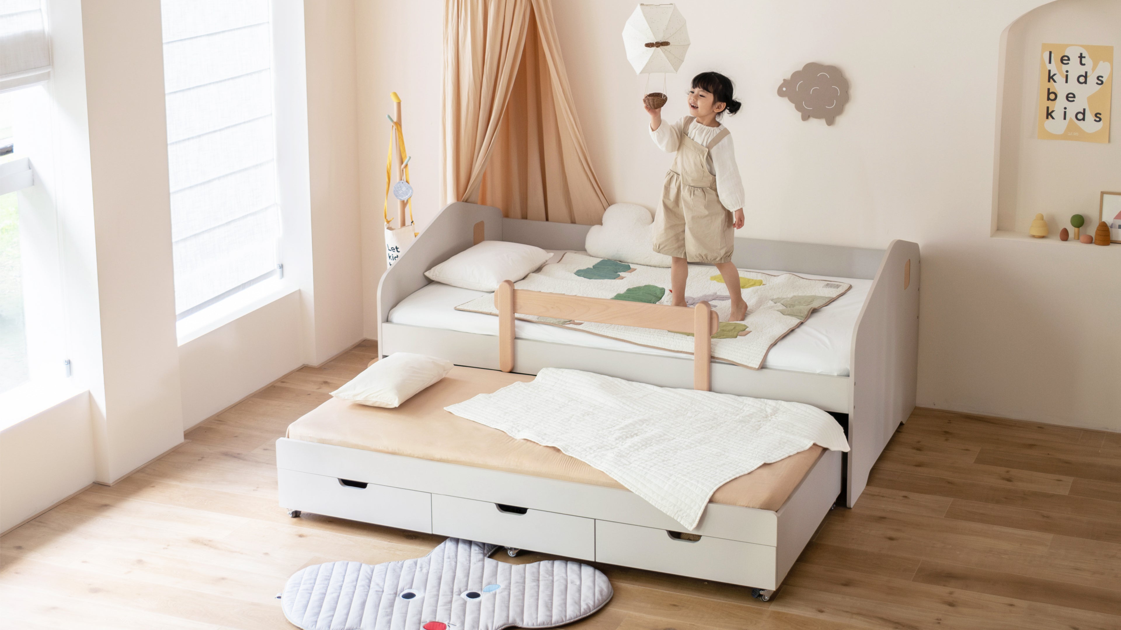 Ready for a bed that sparks imagination? A reversible 3-in-1 design that transitions from a floor bed to a regular or low loft, featuring playful eye hooks and curtains.