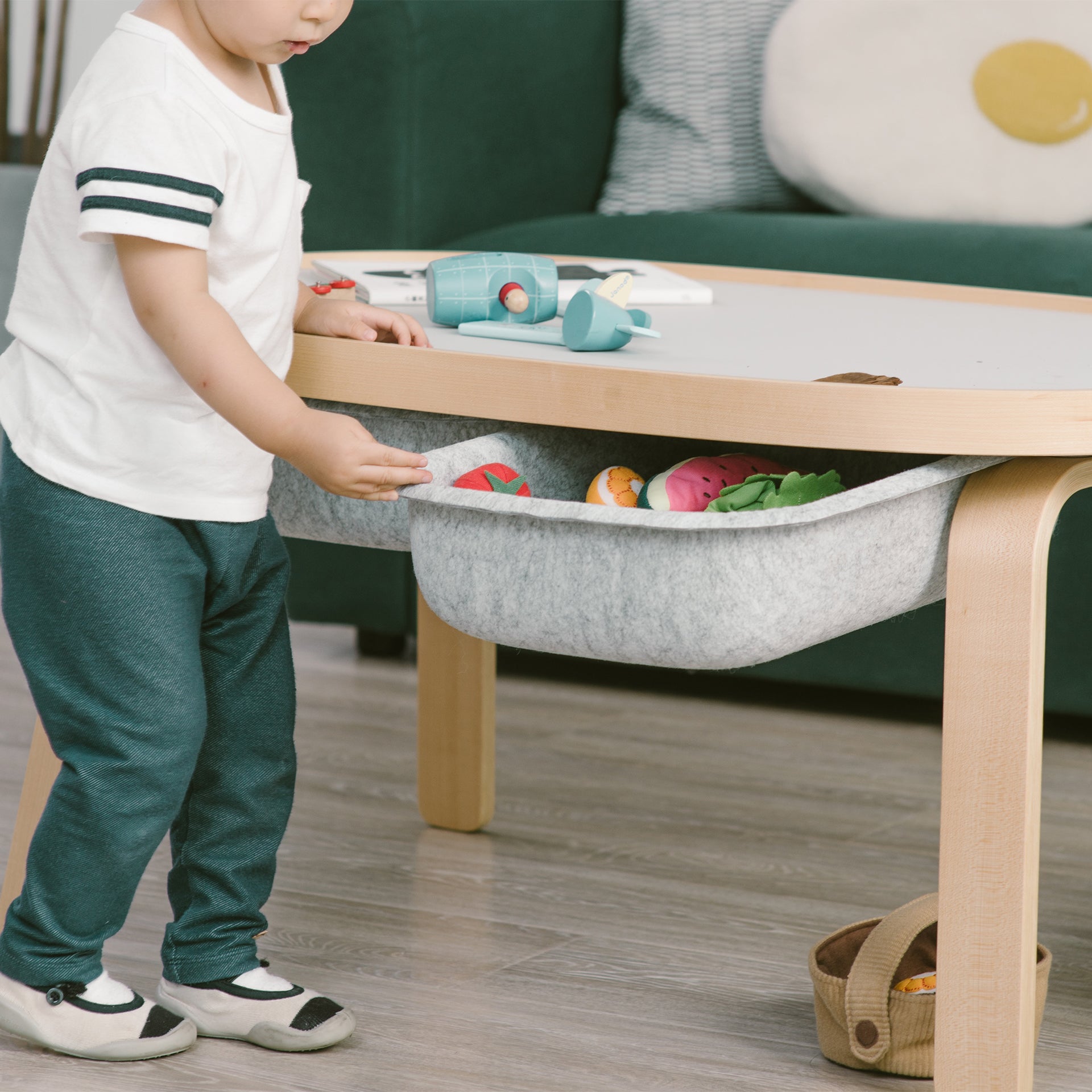 These lightweight felt drawers seamlessly integrate with the table legs, providing secure slots that prevent them from accidentally falling. You can pull them out from either side for easy access, and they are completely removable for flexible storage anywhere you need it.
