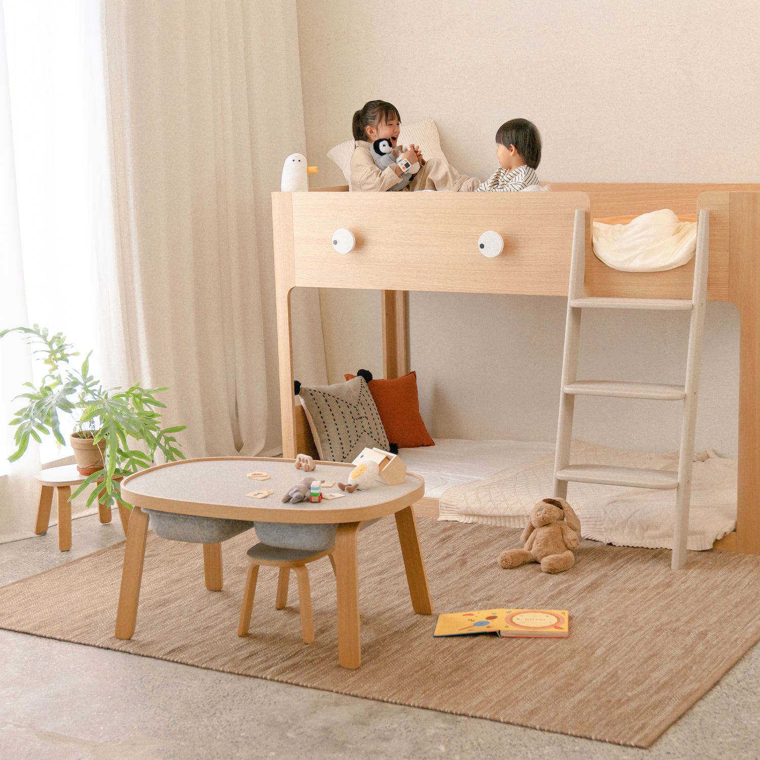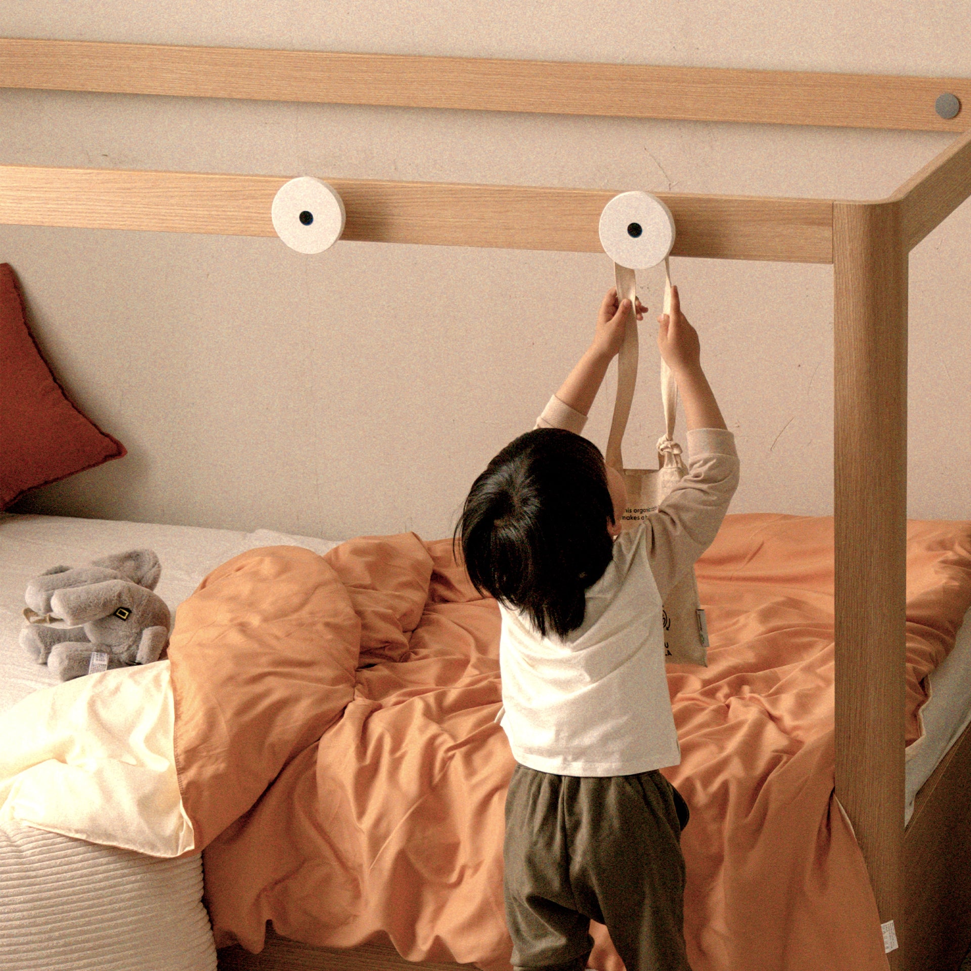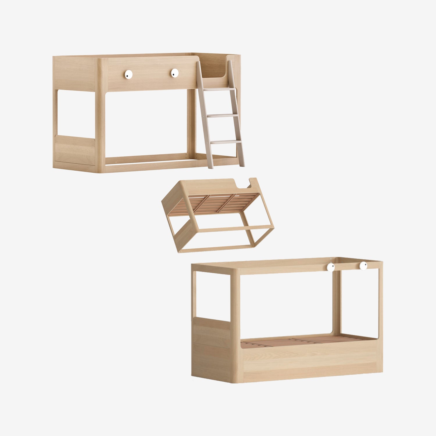 We built in details that simplify your life. The bedposts have a curved and rounded arc to prevent bumps. The ladder is safe, quiet, and its wide pedals have anti-slip grooves. Even better, the removable ladder doubles as a handy wall shelf to save space.