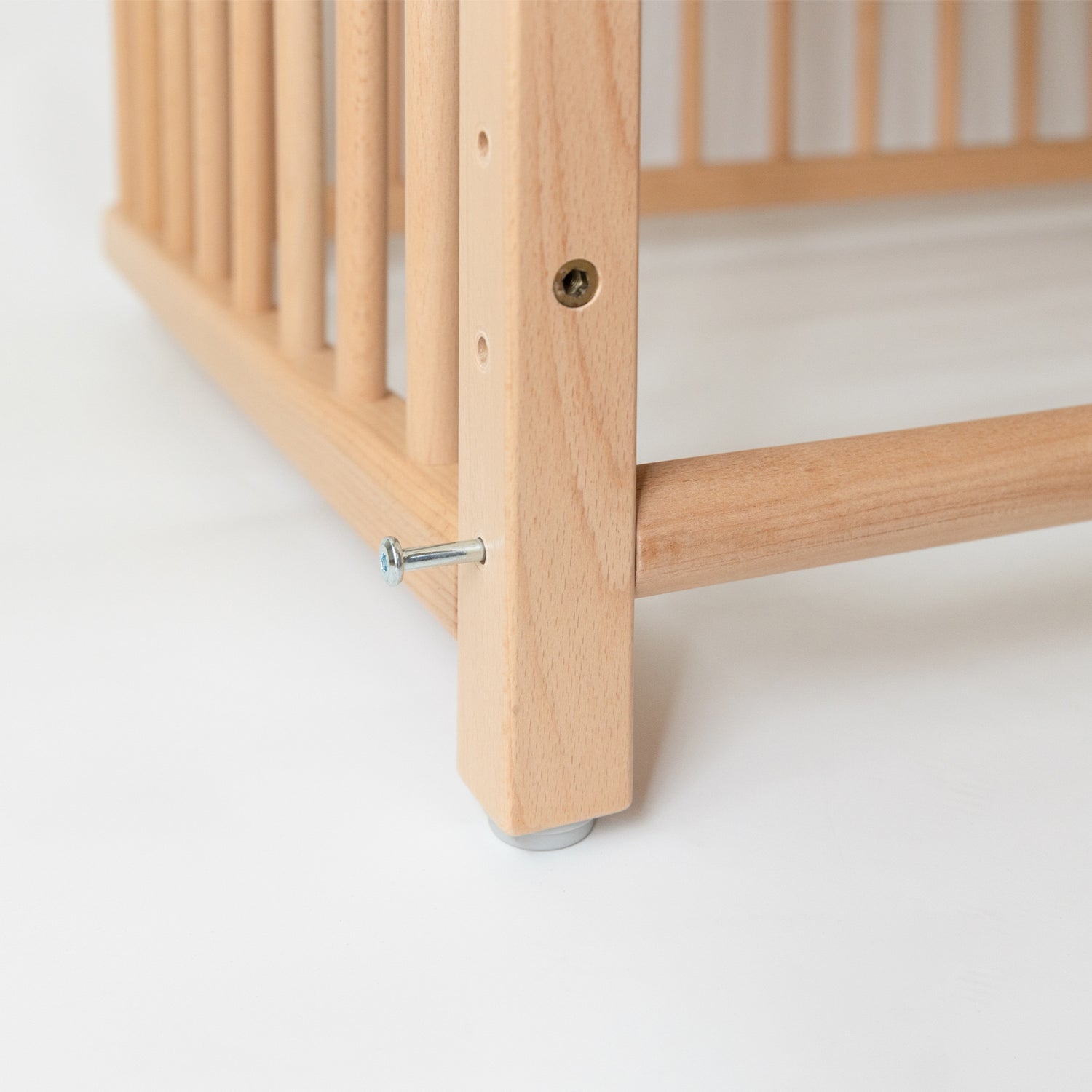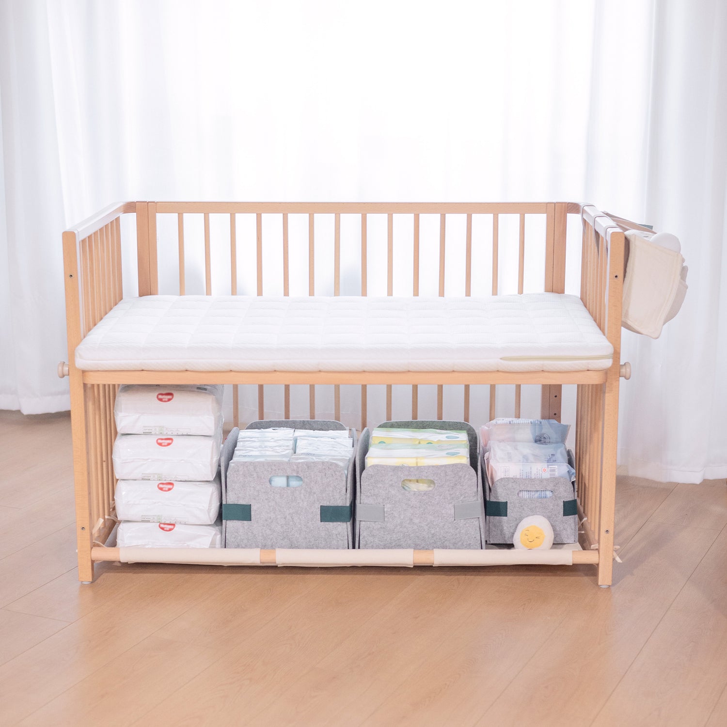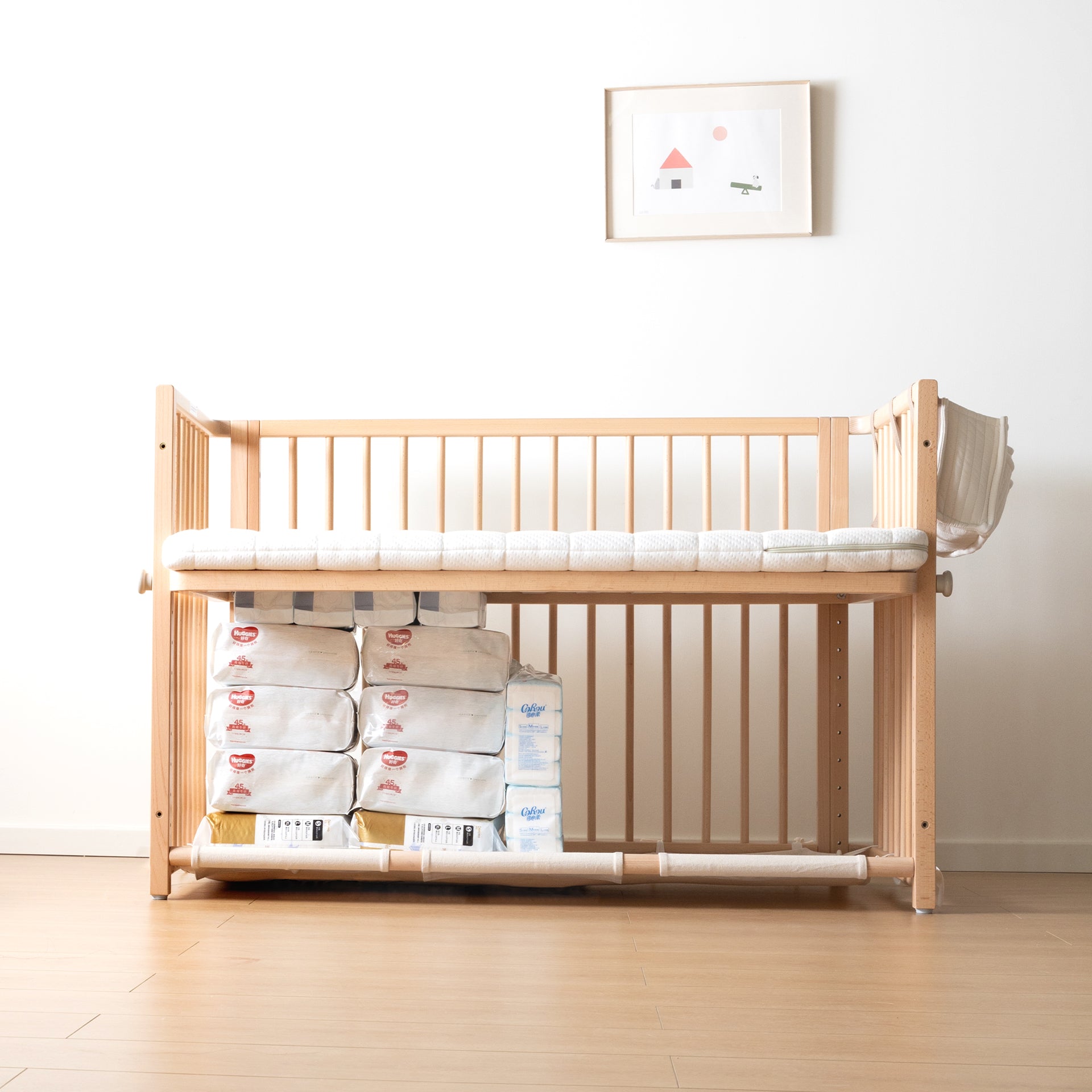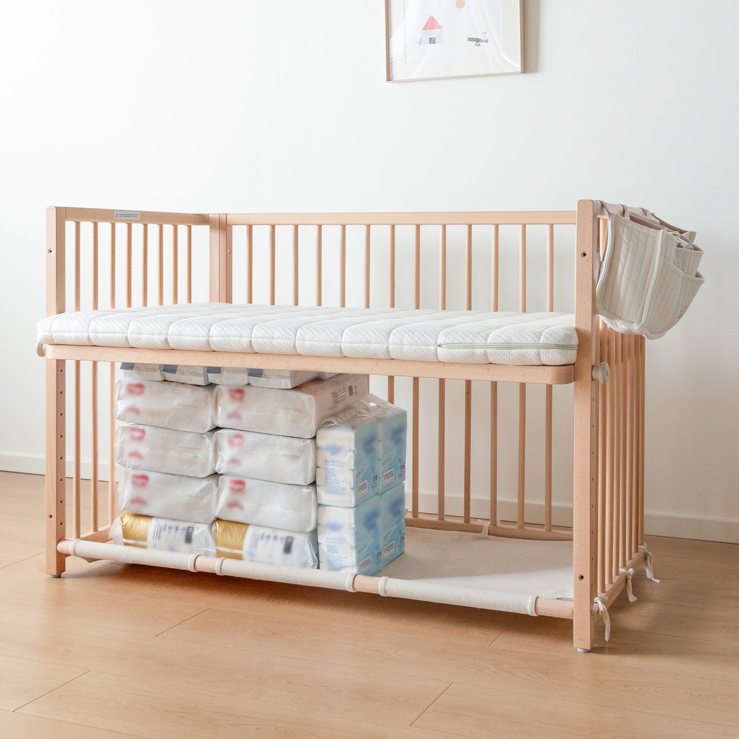 - Ultra Storage Shelf: Solid beech wood, polyester-cotton canvas