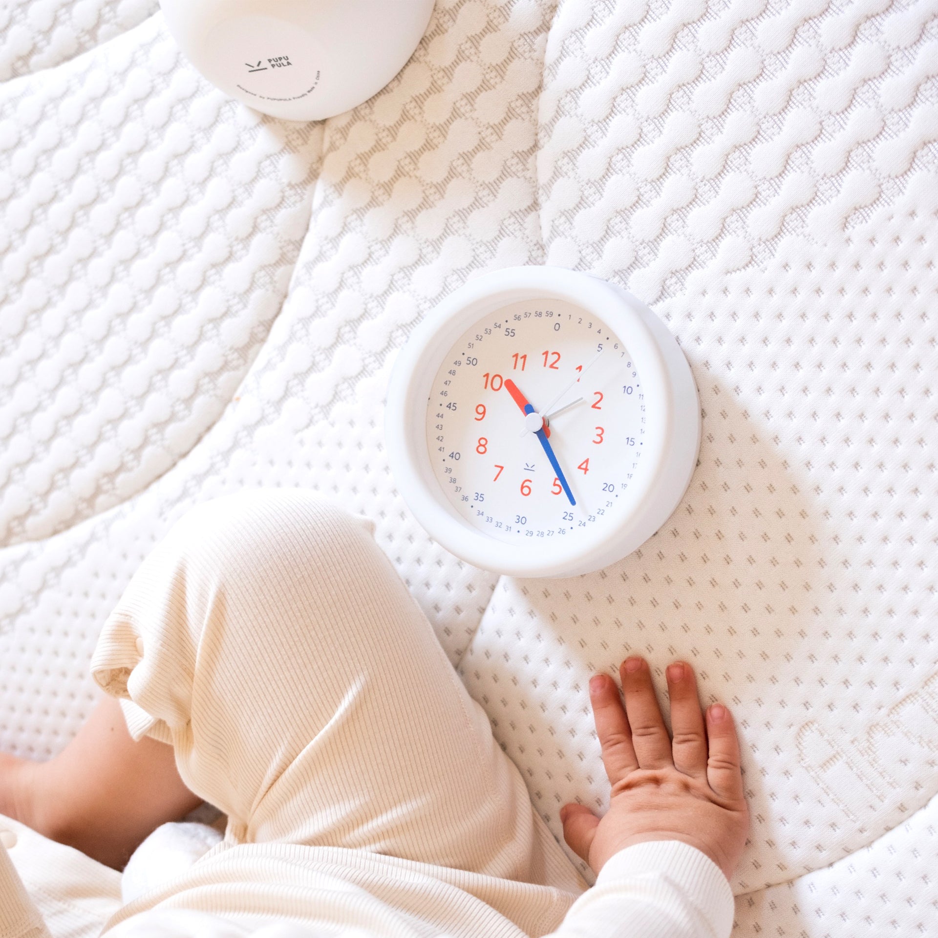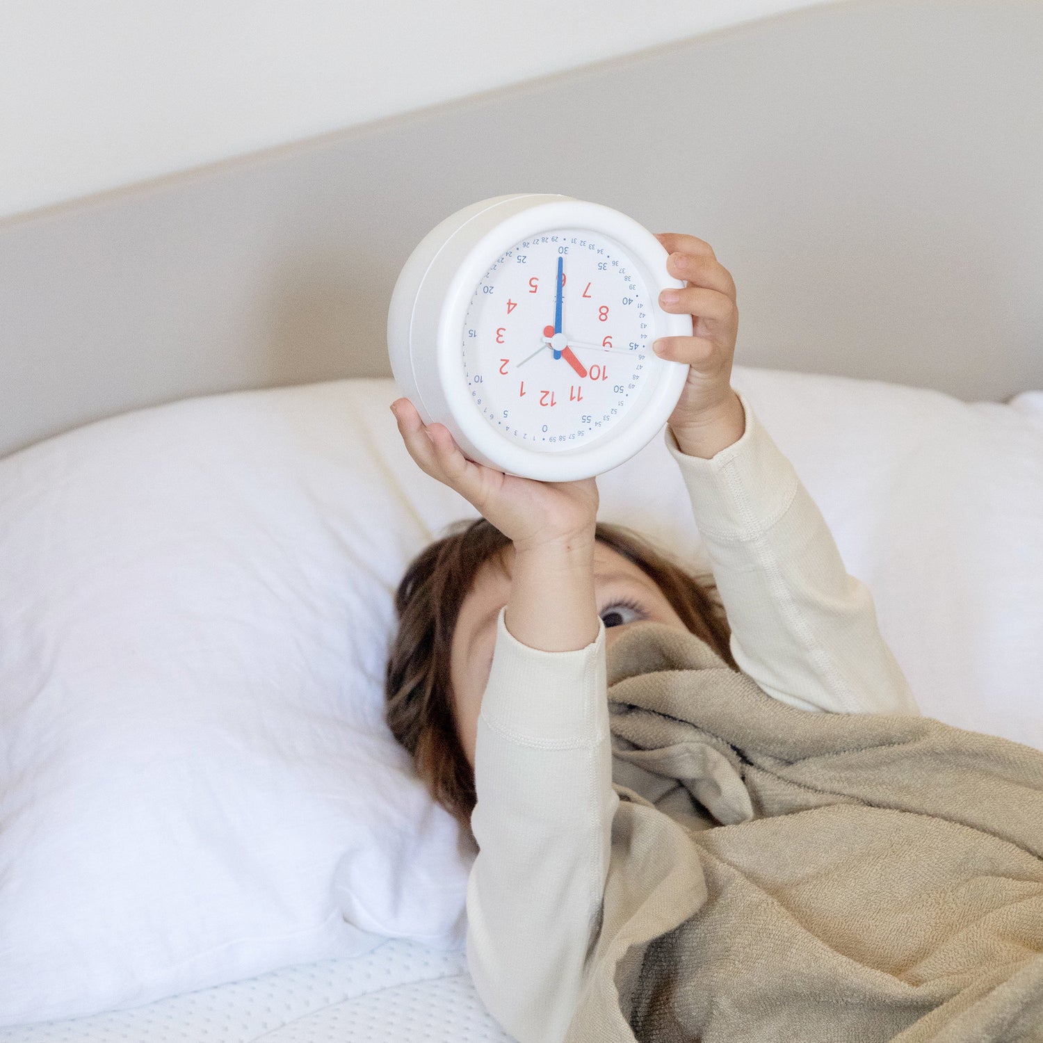 This clock is made for the real world. Its unique design features an upward tilt and a rotatable dial, so it’s always crystal clear. Whether they're standing by the bed, sitting across the room, or just peeking, your child will always have an unobstructed view.