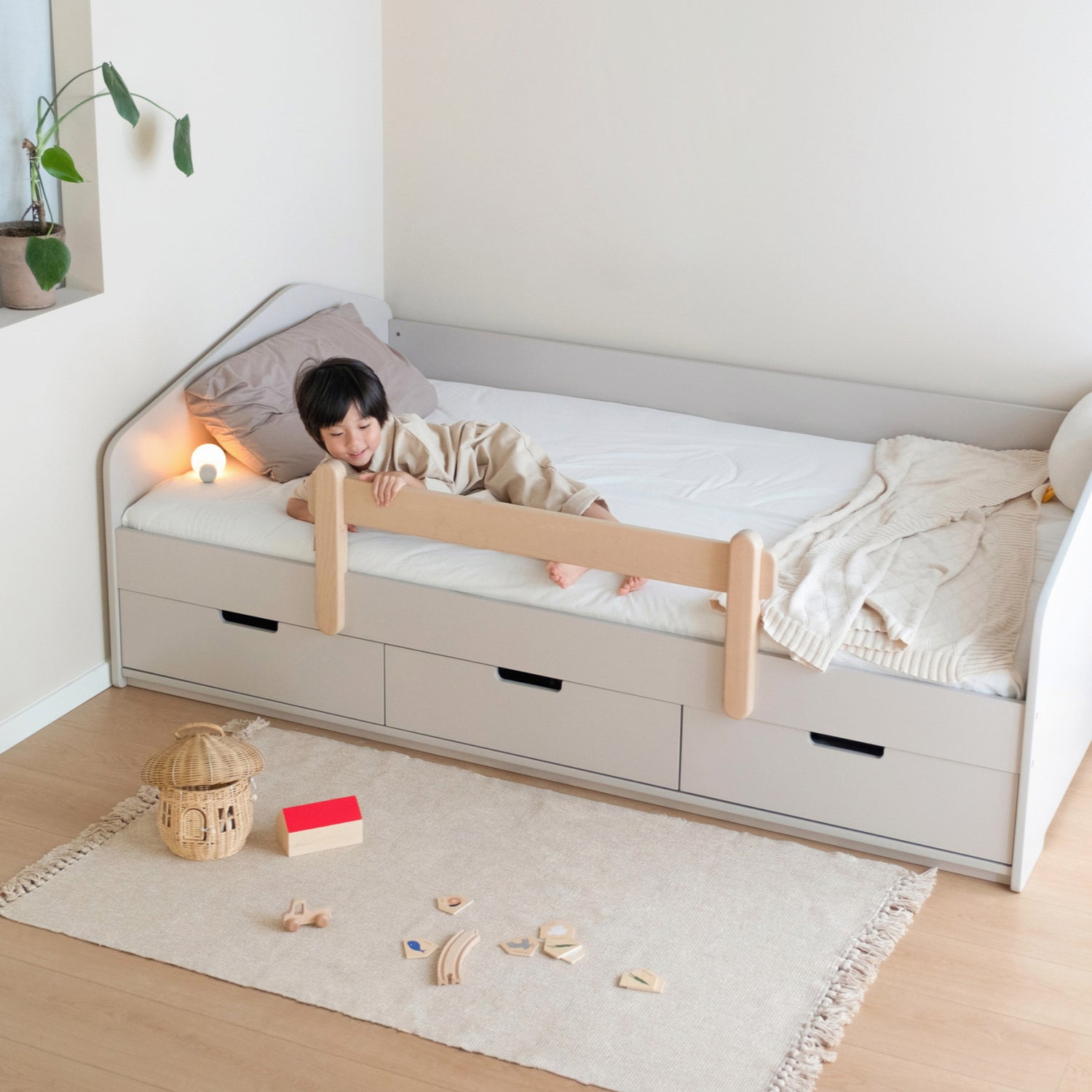 Both the guardrail and the storage bag are designed to seamlessly integrate with your Little House Bed. They provide function without compromising the bed's clean, minimalist, and timeless design.