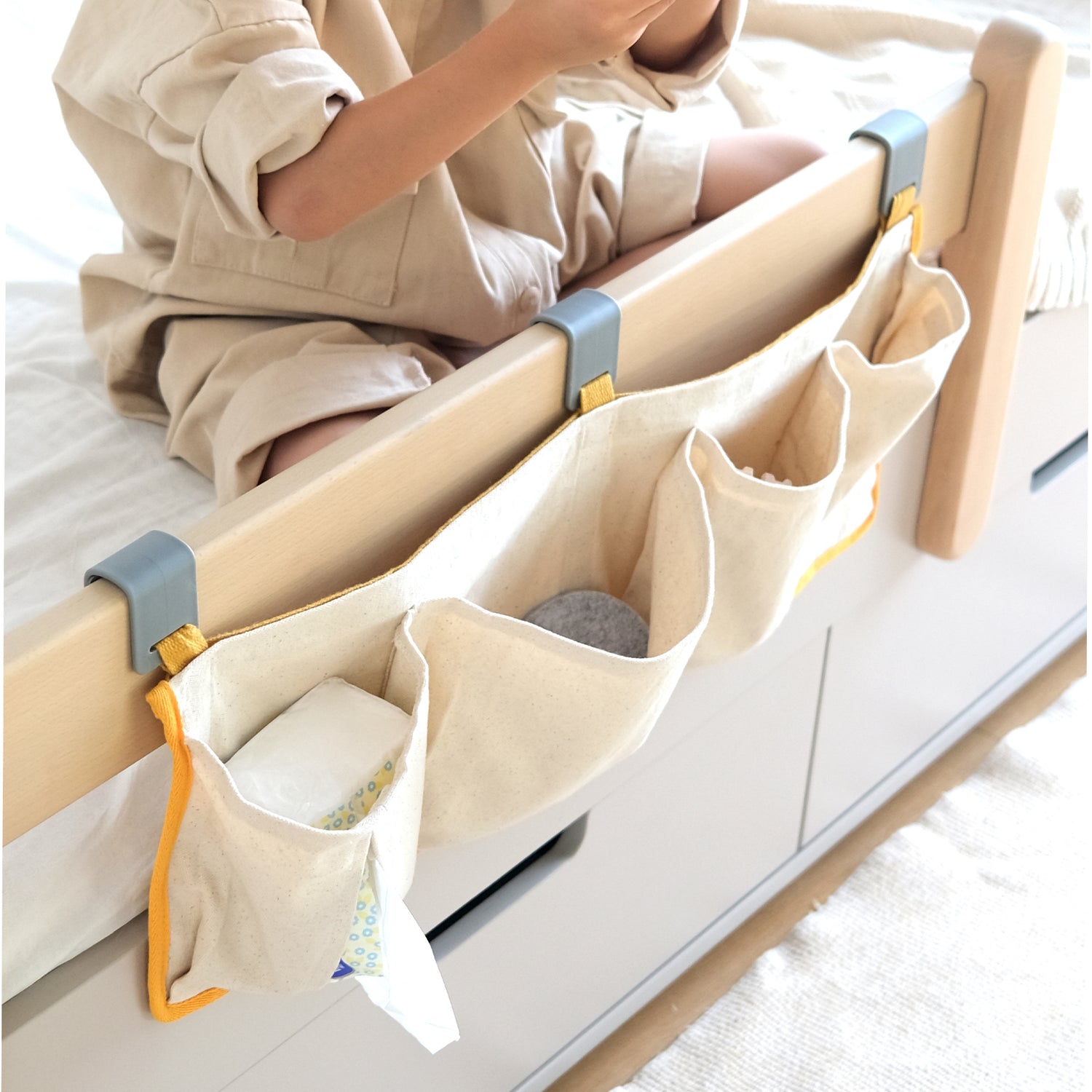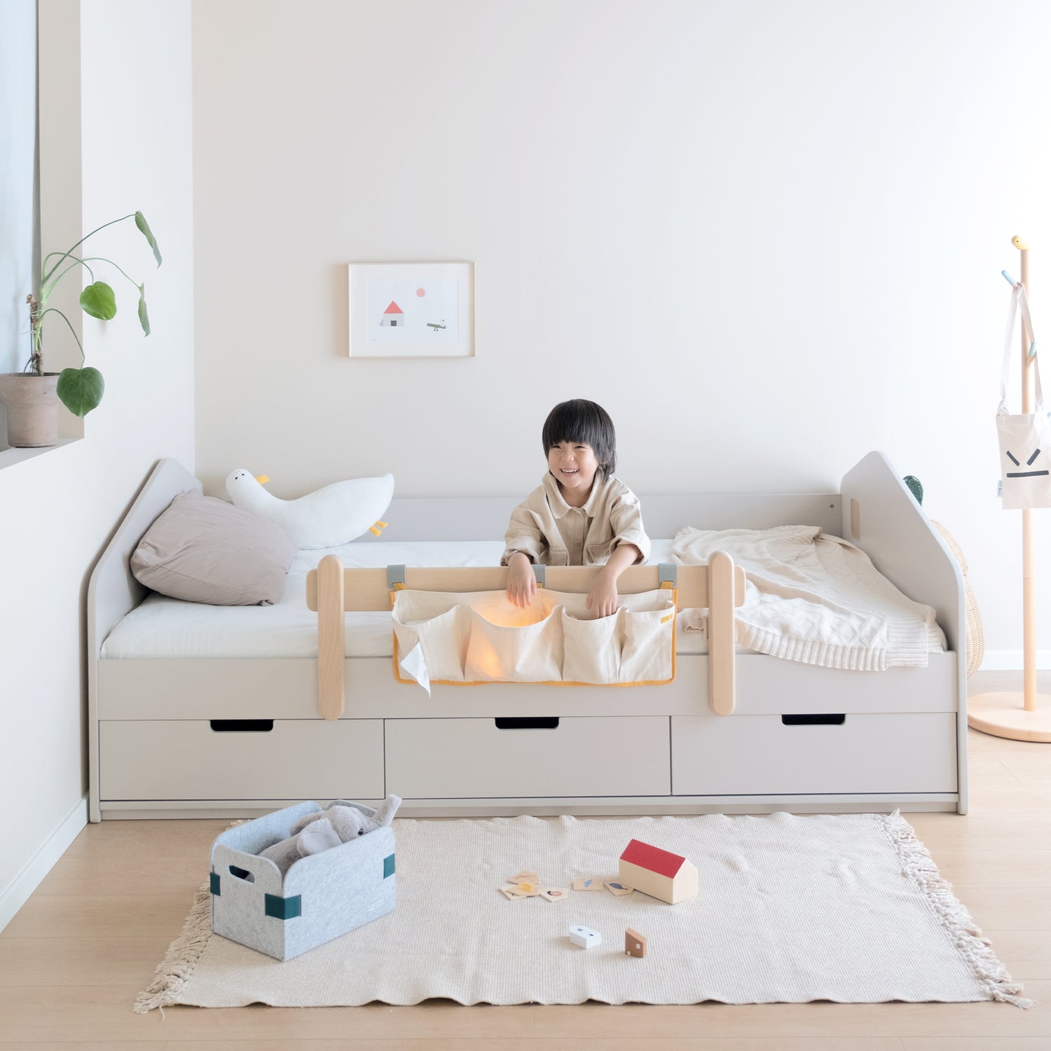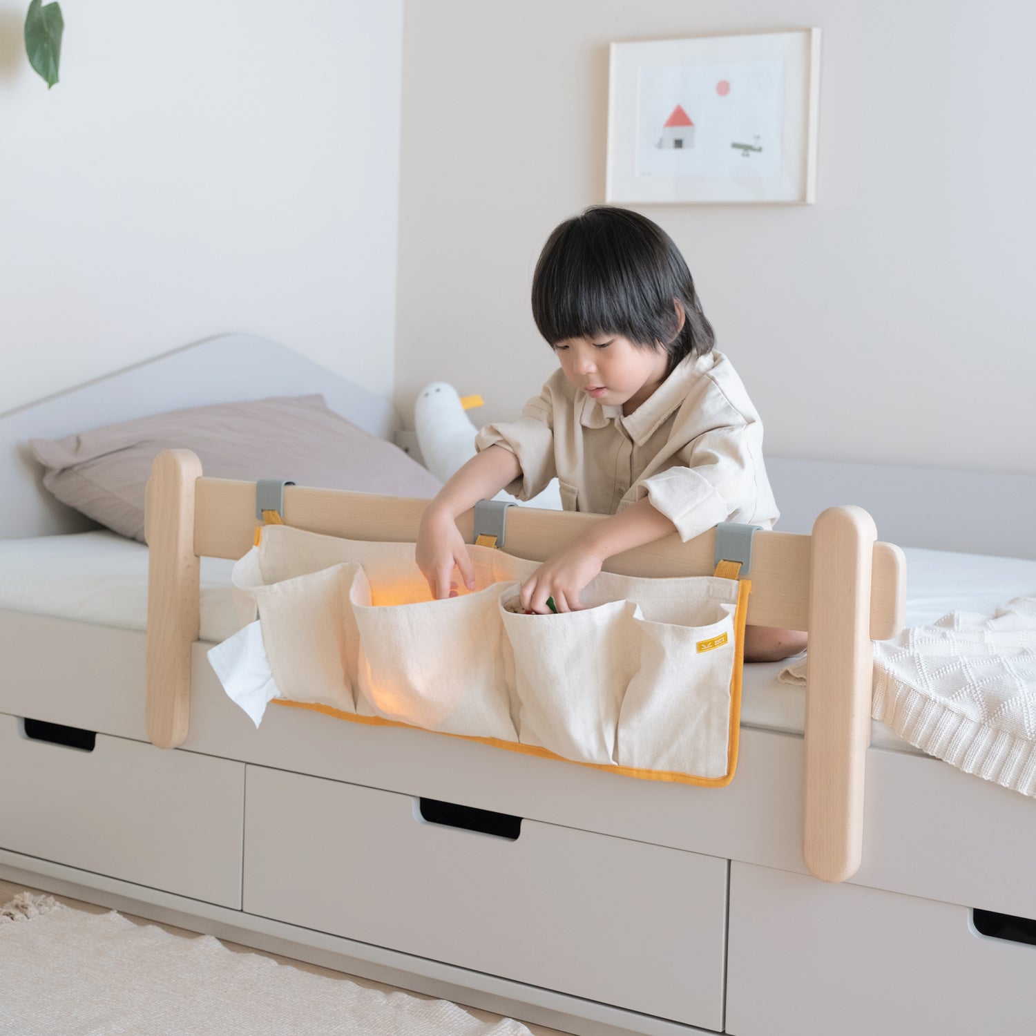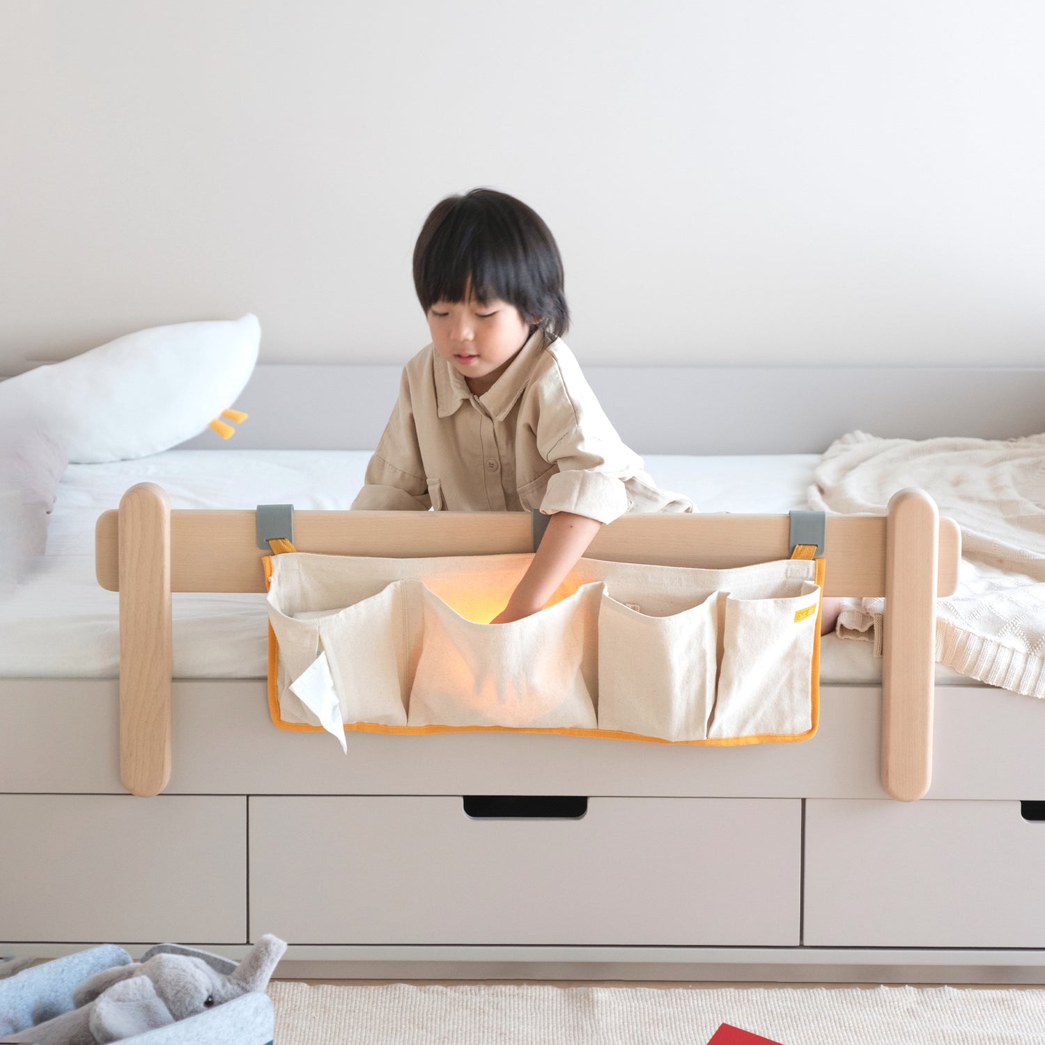 You’ve already solved the big problem, now let’s handle the small daily details. These optional accessories provide essential safety and instant access to everything you need at night. The durable beech guardrail keeps younger children secure, while the handy storage bag clears clutter and ensures tissues, books, and water bottles are always in arm’s reach. Simple solutions that make every bedtime easier.
