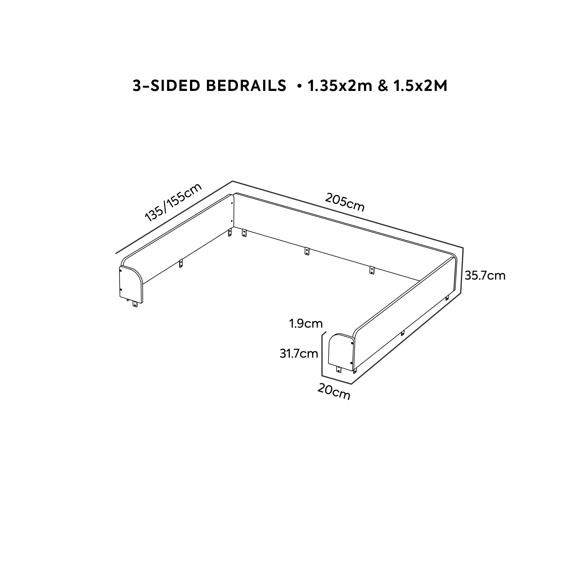 • 3-sided Bedrails - 1.35x2m: 205L × 140W × 30H