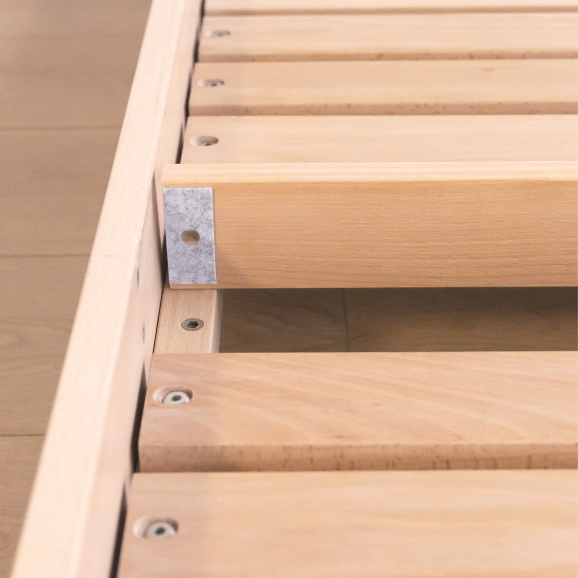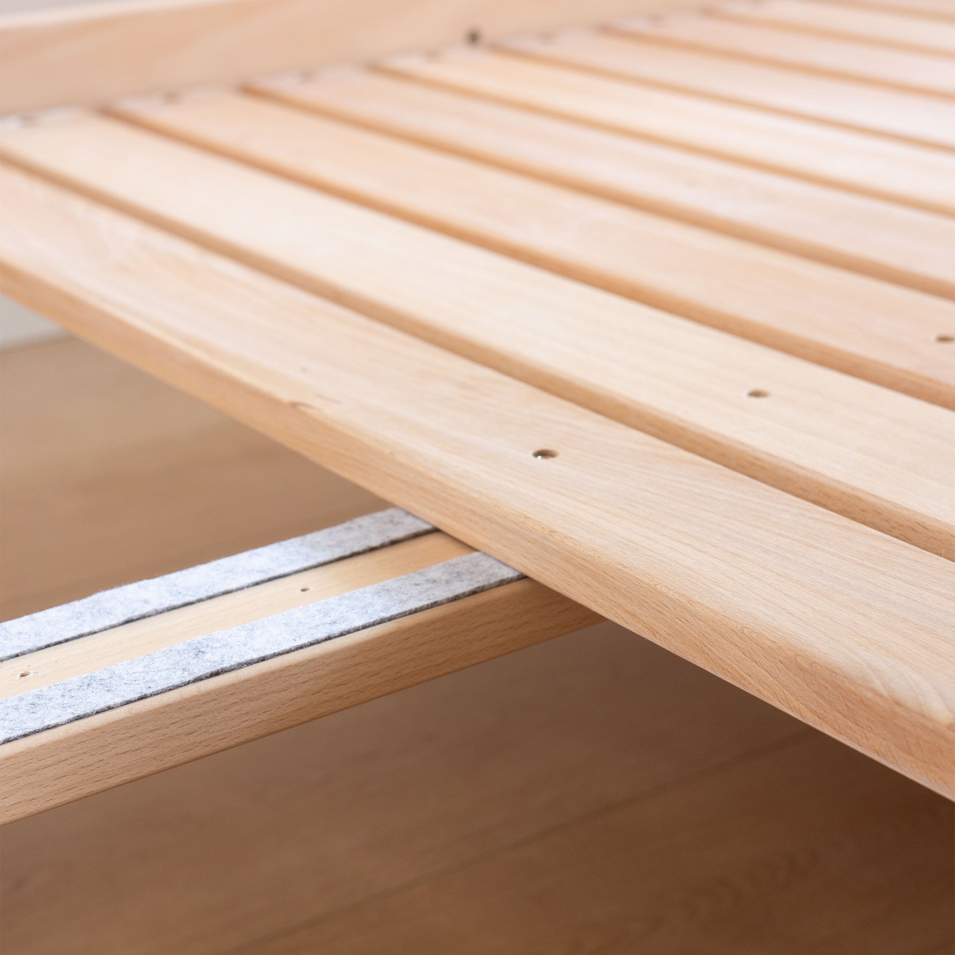 We use traceable German Beech, which is the preferred hardwood by European craftsmen for its fine grain and durability. Thanks to our proven structure, including 23 thick, solid slats, this bed won't budge. That's a certified 1000kg load capacity for your peace of mind.