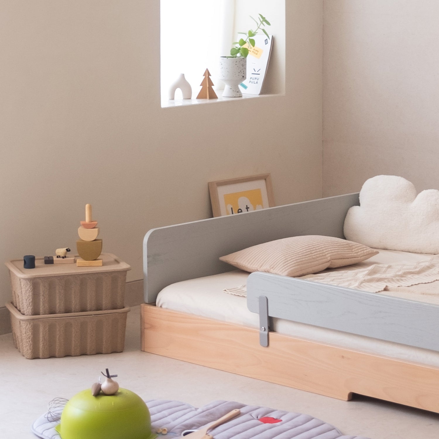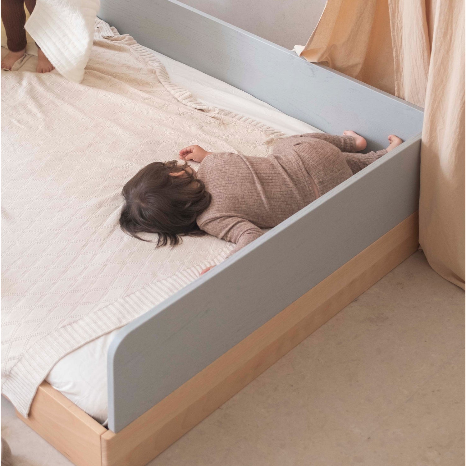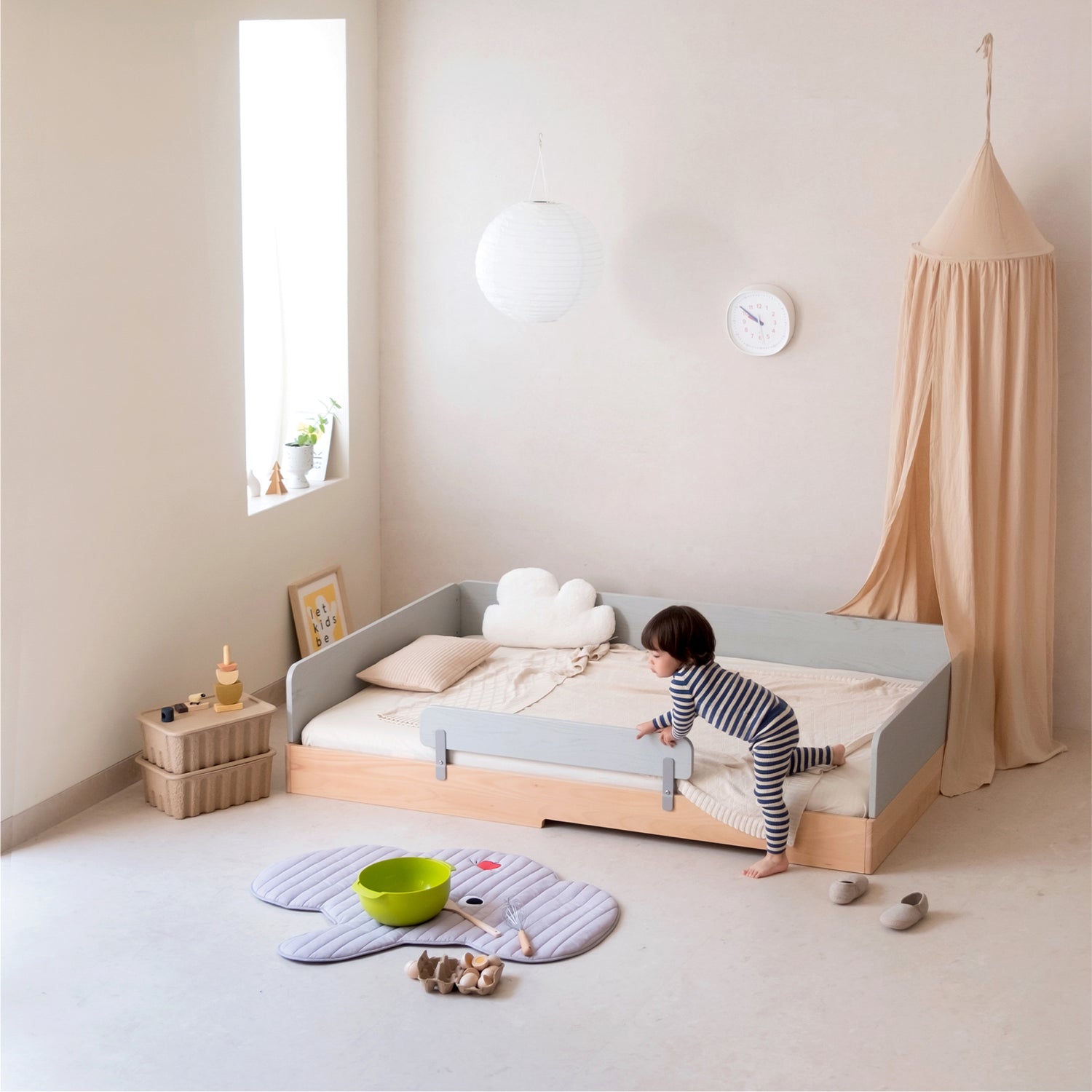 Maria Montessori defined this philosophy simply: "The child must have the right to sleep when he is sleepy, to wake when he has slept enough, and to get up as he pleases." The No. 1 Montessori Floor Bed with 3-sided Bedrails is your secure solution for the big step towards independent sleeping. It gives your child the freedom of a floor bed with the safety you need, making the transition to independent sleep peaceful and confident. Built on our incredibly strong, 1000kg capacity foundation, this bed ensures lasting safety and freedom.