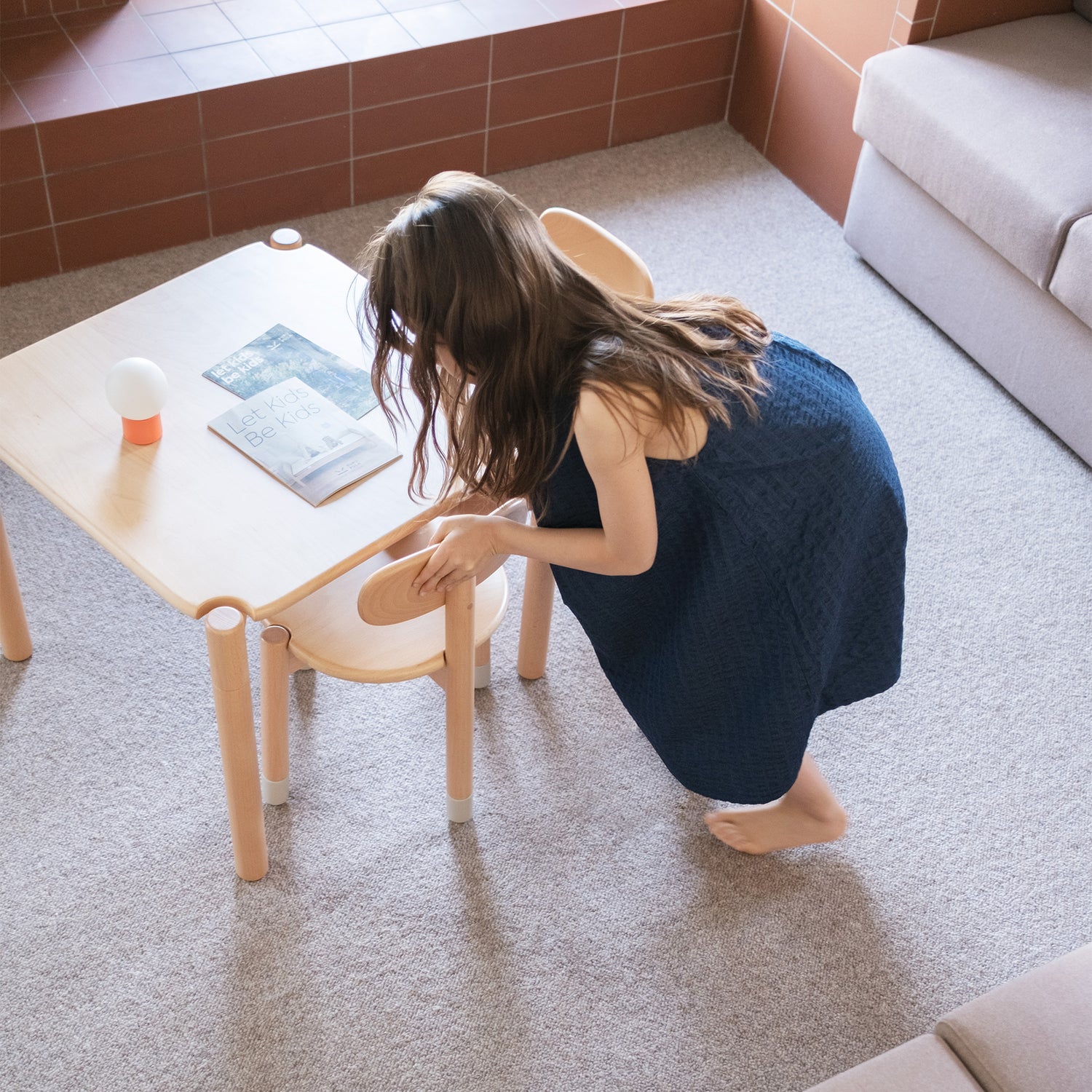 The chair stows away neatly underneath the table, maximising space when not in use. A clever 1cm gap on the table corners meets and exceeds safety standards, so you can have peace of mind knowing there are no pinching risks for little fingers. The design also allows you to use the table leg gaps to hang bags, adding practical, safe storage.